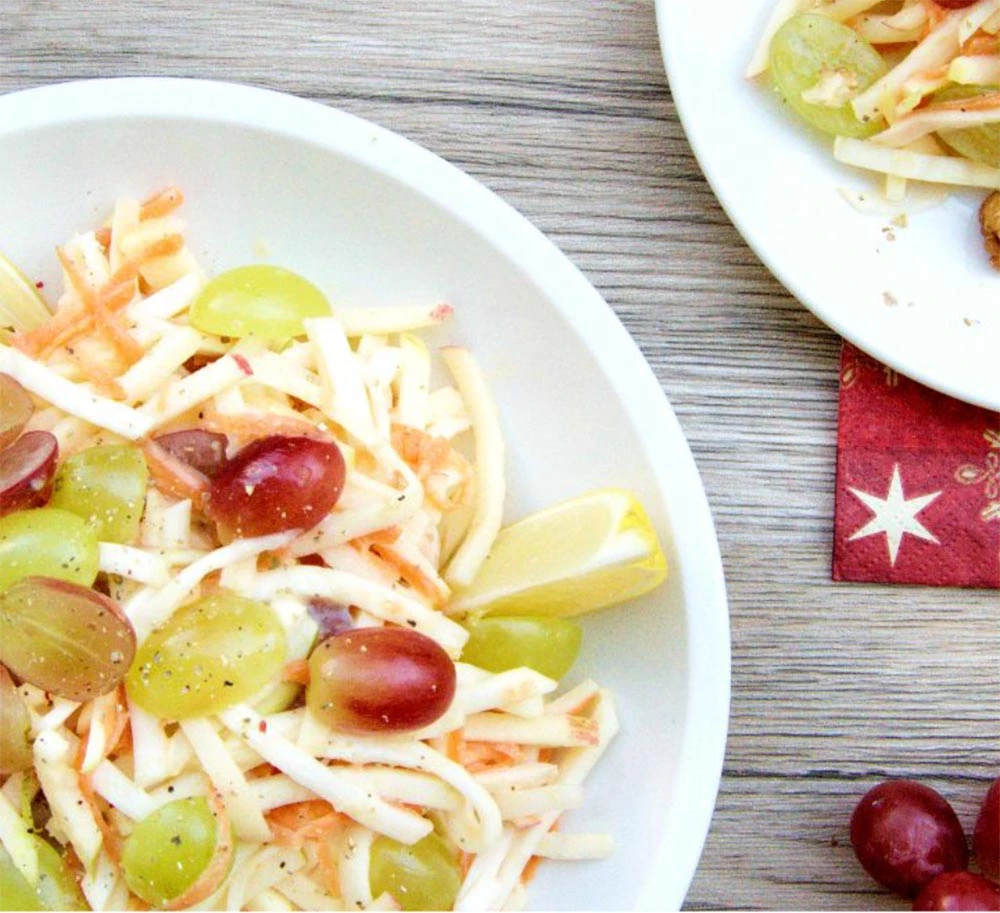 Verter el aliño sobre la ensalada y mezclar bien. Lavar y cortar las uvas por la mitad, mezclarlas con la ensalada y servir.