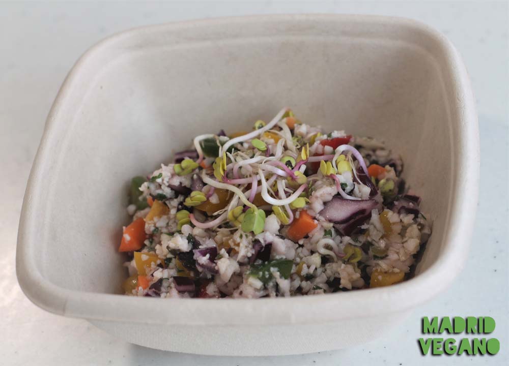 Nos explica Sonia Pinto que su idea es crear cada día un plato completo y sano compuesto por una ración de cereales, otra de vegetales y una tercera de proteínas vegetales -con varias opciones para los tres grupos. En cuanto a la manera de cocinar, además de que todo es vegano y sin gluten -sin trazas-, nos cuenta que utiliza aceite de oliva extra, agua filtrada y que no usa ni refinados ni procesados. Asimismo cada menú lo elabora con alimentos de temporada, de proximidad y ecológicos y los envases son biodegradables. En las fotos que ilustran el artículo podéis ver algunos de los platos de La Veggyteca que cambian cada semana.